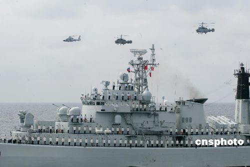“和平使命-2005”中俄聯(lián)合軍事演習第三階段8月23日在中國山東半島及其附近海域舉行。圖為中俄艦機編隊接受聯(lián)合導(dǎo)演部檢閱時,中方艦艇駛過觀摩艦時情景。作者:王麗南