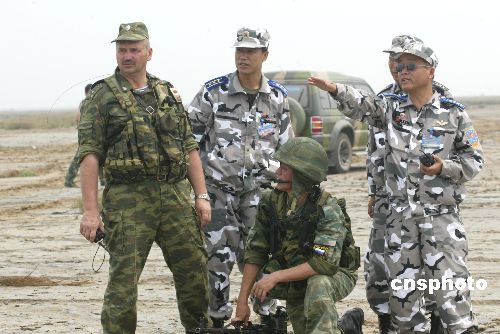 “和平使命-2005”中俄聯(lián)合軍事演習(xí)最后一個(gè)實(shí)兵行動課目——強(qiáng)制隔離作戰(zhàn)演練,25日上午在濟(jì)南軍區(qū)濰北靶場舉行。圖為中俄空軍軍官在演習(xí)區(qū)域交流任務(wù)完成情況。作者:王麗南