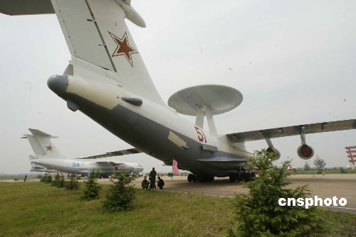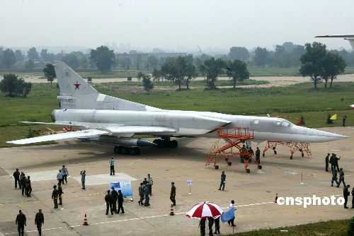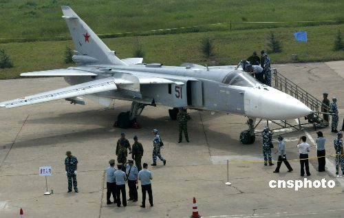 中新網8月26日電 26日上午,參加“和平使命-2005”中俄聯合軍事演習的俄羅斯空軍裝備在青島流亭機場進行展示。中共中央政治局委員、中央軍委副主席、國務委員兼國防部長曹剛川觀看展覽。