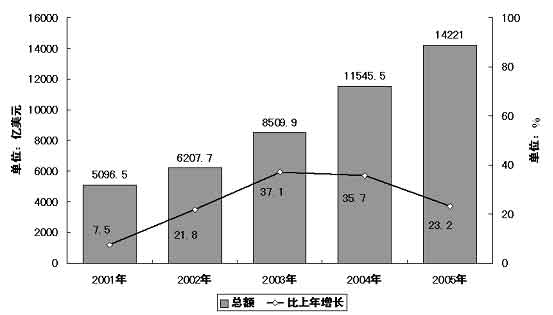 圖表五 “十五”期間外貿(mào)進(jìn)出口總額及其增長(zhǎng)情況