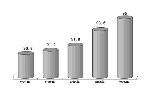 圖表七 “十五”期間全國(guó)義務(wù)教育人口覆蓋率 (單位:%)