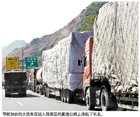 前天上午,巡邏民警從京港澳高速韶關(guān)段北上,只見乳源服務(wù)區(qū)入口、云巖服務(wù)區(qū)南行入口均有長達(dá)一公里左右的加油車龍。據(jù)了解,近日京珠北各服務(wù)區(qū)都出現(xiàn)大貨車排隊(duì)進(jìn)服務(wù)區(qū)加油的現(xiàn)象,南下的大貨車在湖南境內(nèi)每次只能加到200元的柴油,在京珠北境內(nèi)服務(wù)一次加油最多也是400元,限量供應(yīng)柴油造成了大貨車逢服務(wù)區(qū)必須進(jìn)站加油。行駛的大型車缺油、車龍?jiān)诼访媾抨?duì)進(jìn)服務(wù)區(qū)加油都給交通安全帶來壓力。