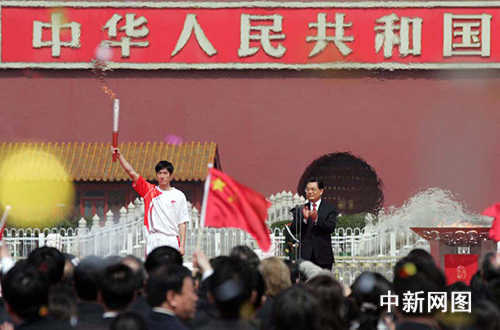 3月31日,北京奧運(yùn)會(huì)圣火歡迎儀式暨傳遞啟動(dòng)儀式在北京天安門廣場(chǎng)啟動(dòng)。圖為著名運(yùn)動(dòng)員、火炬手代表劉翔從胡錦濤主席手中接過火炬。中新社發(fā) 張宇 攝