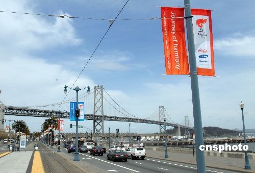 當(dāng)?shù)貢r間四月八日,舊金山海灣大橋附近的濱海大道,“二00八北京奧運火炬接力”旗幟高掛。北京奧運圣火當(dāng)天凌晨抵達(dá)舊金山,九日將進行六英里長的火炬接力,屆時將有成千上萬的華人華僑前往現(xiàn)場迎接。