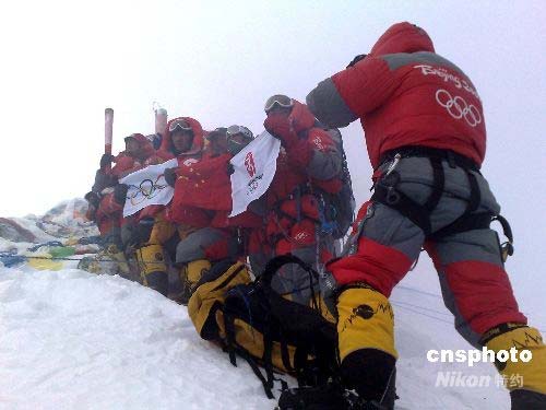 5月8日,北京奧運圣火珠峰傳遞登山隊成功登頂珠穆朗瑪峰。這是登山隊員在峰頂展示“祥云”火炬、火種燈、中國國旗、奧運五環(huán)旗和北京奧運會會徽旗。中新社發(fā) 阿旺扎西 攝