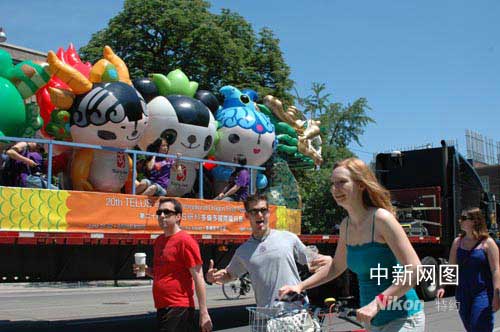 中新網(wǎng)多倫多6月18日電 2008北京奧運吉祥物“五福娃”參加第20屆多倫多國際龍舟節(jié)花車巡游,與中國傳統(tǒng)的龍舟共同傳遞來自北京奧運的美好祝福,受到多倫多市民的熱烈歡迎。