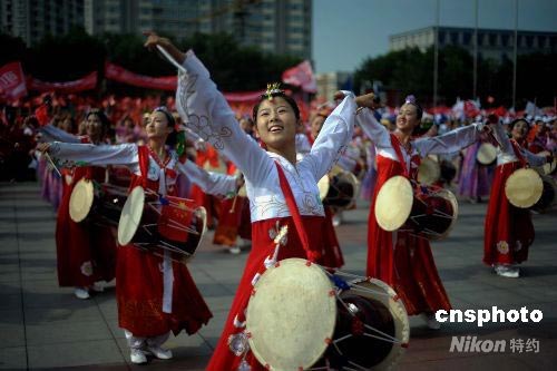 7月14日,奧運(yùn)火炬在吉林長(zhǎng)春傳遞,長(zhǎng)春的朝鮮族姑娘舞起長(zhǎng)鼓迎接圣火。 中新社發(fā) 廖攀 攝