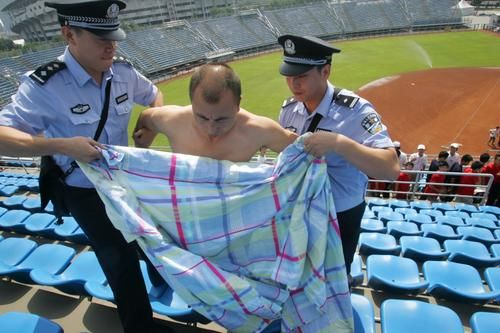 當日,在“比賽”中,紅藍兩個球隊的數(shù)十名球迷因觀賽突發(fā)“騷亂”,互相謾罵推搡,兩名志愿者立即打出“您的行為已違反《觀賽規(guī)則》,請立即停止”的藍色警告牌,但雙方情緒激動,有人扭打成一團。豐臺公安分局民警迅速到場,將兩名打架男子帶下看臺。擁擠中,一名女子受傷,被場內(nèi)急救人員扶出賽場救治。突然,一個“球迷”脫下上衣狂奔,被民警火速攔下,裹上被單帶走,賽場秩序恢復正常。