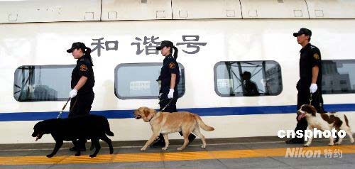 7月14日,沈陽鐵路公安處警犬基地的3只搜爆犬正式投入沈鐵公安的奧運(yùn)安保工作中。據(jù)了解沈陽鐵路公安處警犬基地共有37只警犬,其中大部分為德國牧羊犬,承擔(dān)著巡線護(hù)線任務(wù),這次投入搜爆、安檢工作的主要為史賓格、拉布拉多等犬種,它們將在奧運(yùn)安保期間負(fù)責(zé)站臺(tái)、貴賓室等重要地點(diǎn)的安檢及搜爆工作,以確保鐵路的安全。中新社發(fā) 趙敬東 攝
