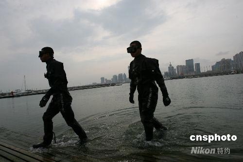青島邊防支隊駐奧帆中心的特勤官兵暑期在奧運會帆船比賽場地進行適應性潛水訓練,在貼近實戰(zhàn)狀態(tài)下提高隊員處置突發(fā)事件等能力。第29屆奧運會帆船帆板比賽將于2008年8月9日至23日在青島國際帆船中心及周邊水域舉行。中新社發(fā) 王瑤 攝