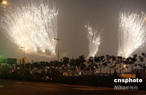 7月16日晚,北京奧運(yùn)會(huì)開(kāi)幕式彩排首次燃放禮花,鳥(niǎo)巢上空絢爛多彩。中新社發(fā) 吳芒子 攝