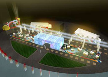廣場內(nèi)最受矚目的,是聳立于鐘樓前的半透明迷你“水立方”模型,晚上配合藍色燈光,將水立方的晶瑩剔透表露無遺,市民可以穿過水立方作近距離接觸,而奧運吉祥物福娃會站立于水立方側(cè)。每晚8點半至10點,每隔半小時水立方將加插燈光匯演,在奧運主題音樂“We are ready”音效下,呈現(xiàn)千變?nèi)f化的燈光效果。
