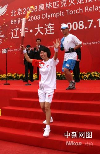 7月19日,北京奧運(yùn)火炬在大連傳遞,被譽(yù)為“東方神鹿”的奧運(yùn)會(huì)長(zhǎng)跑冠軍王軍霞起跑第一棒火炬。記者周兆軍攝