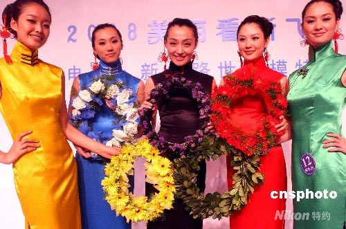 7月20日,2008美麗看新飛--新絲路世界模特大賽中國區(qū)總決賽在遼寧大連啤酒節(jié)上舉行,是次賽事經(jīng)過在中國5大城市巡演后的最后一站。15名中國賽區(qū)職業(yè)選手參加了5大城市巡演選拔,最后角逐出了10名最佳模特參加10月在北京舉行的新絲路世界模特大賽國際總決賽。圖為參賽模特選手身穿五色旗袍展示五環(huán)奧運風(fēng)采。 中新社發(fā) 錢興強(qiáng) 攝