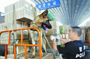今天上午10時,記者在北京西站行李房看到,5名訓(xùn)導(dǎo)員帶領(lǐng)5條警犬對所有托運的行李進行安全檢查。其中3名男民警帶領(lǐng)黑色和淺黃色的拉布拉多犬,而首次出場的女訓(xùn)導(dǎo)員帶領(lǐng)黃色帶棕色斑點的史賓格犬。女警們身穿黑色的警服T恤,黃色的袖標(biāo)上面印有盾牌,貼著“搜爆”標(biāo)志,女警們個個顯得英姿颯爽。一名23歲年輕漂亮的女警魯卓鼓勵了一下自己的愛犬——1歲多的搜爆犬杰瑞,發(fā)出“搜”的一聲指令,杰瑞立即順著女訓(xùn)導(dǎo)員手指的方向躥向了旁邊的一排大行李箱,努力嗅了起來。一直工作了三四十分鐘,杰瑞在行李房沒有發(fā)現(xiàn)可疑物品,又回到了魯卓的身旁。魯卓向警犬表示了友好,好好地鼓勵了它一下。