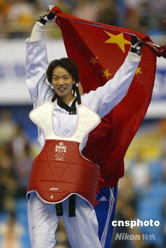 2007年5月22日,在北京跆拳道世錦賽最后一場比賽的爭奪中,奧運會冠軍陳中獲得女子72公斤以上級的冠軍,實現(xiàn)大滿貫的夢想。中新社發(fā) 杜洋 攝