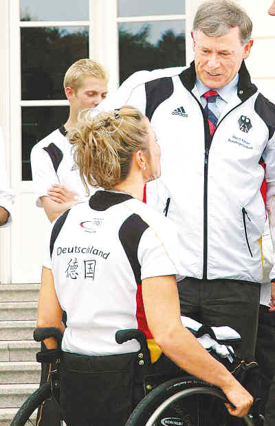克勒還愉快地接受了在場中國記者的采訪。在談到德國代表團的目標(biāo)時,克勒說,他不想給運動員增加壓力,重要的是,大家要從比賽中獲得快樂,各國運動員要為世界人民的互相理解做出貢獻?死崭嬖V本報記者,他將高興地按原計劃參加北京殘奧會開幕式。