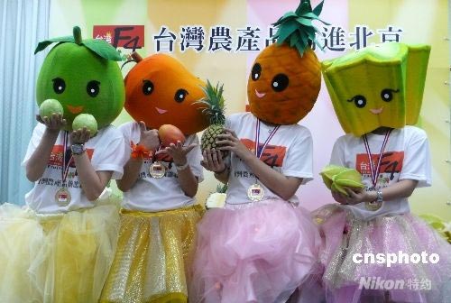 7月30日,臺(tái)灣“農(nóng)委會(huì)”在臺(tái)北舉行“臺(tái)灣農(nóng)產(chǎn)品前進(jìn)北京”記者會(huì),表示獲選奧運(yùn)推薦水果的臺(tái)灣鳳梨(菠蘿)、楊桃、芭樂(lè)(番石榴)、芒果共計(jì)10噸,正由島內(nèi)陸續(xù)運(yùn)往北京專(zhuān)供奧運(yùn)村。圖為記者會(huì)上,四名戴著水果頭套、裝扮成奧運(yùn)水果運(yùn)動(dòng)員的女生展示這四種水果,代表臺(tái)灣水果“前進(jìn)”北京奧運(yùn)啟動(dòng)。 中新社發(fā) 董會(huì)峰 攝