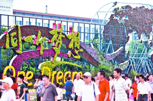 西側(cè)花壇的主題為“改革開放共譜和諧篇章”。花壇北段為彩虹門與中國結(jié)的組合造型,從花山上流下一條五彩的花溪,花溪鑲嵌有象征56個民族的56朵花和為廣大群眾熟悉的心手相連圖案,寓意全國人民萬眾一心、眾志成城、同心同德、團(tuán)結(jié)奮斗建設(shè)社會主義和諧社會。同時也寓意心手相連、抗震救災(zāi)的決心。南段花壇通過杭州灣大橋、嫦娥奔月工程、北京新地標(biāo)性建筑和農(nóng)業(yè)豐收景象,體現(xiàn)我國改革開放30年來取得的巨大成就。