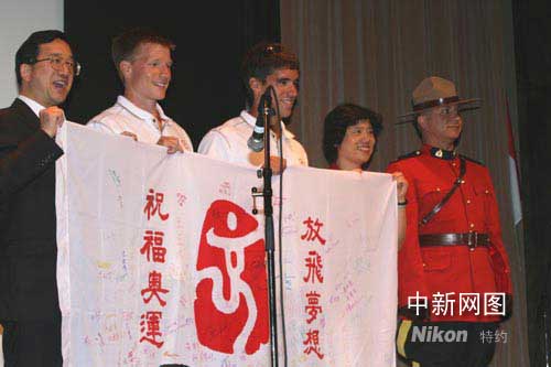 精彩的演出中,兩位陽光小伙——加拿大皮劃艇國家隊隊員,奧運選手希爾和莫蒂默的到來讓觀眾格外興奮。而對于主持人黃源博士精心準備的加試——“筷子夾乒乓球”,他們輕松過關(guān),獲得了在場所有人簽名祝福的奧運五環(huán)旗這一特別禮物。他們也表示將會帶著大家的祝愿,盡最大努力實現(xiàn)目標。