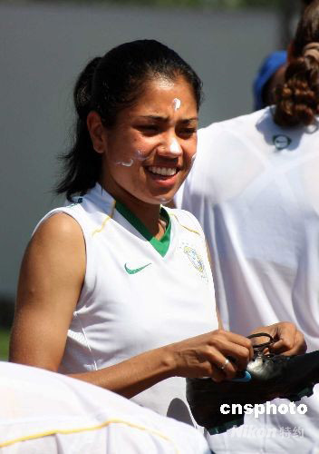 8月3日,巴西女足隊員在沈陽奧體中心訓(xùn)練場進(jìn)行訓(xùn)練,隊員練前涂抹防曬霜。當(dāng)日,沈陽氣溫為31攝氏度,天氣預(yù)報顯示未來72小時沈陽都將是32~22攝氏度、風(fēng)力小于3級的晴好天氣。中新社發(fā) 張宇 攝