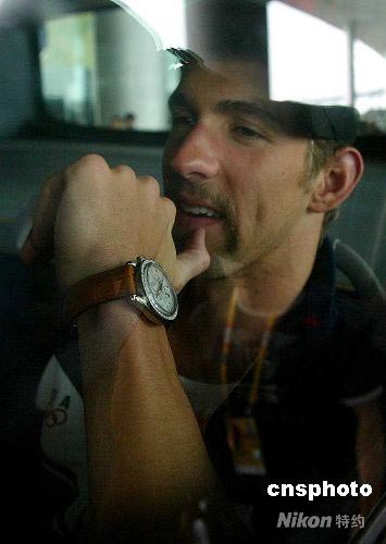 8月4日,美國(guó)游泳隊(duì)一行40余人抵達(dá)北京,開始北京奧運(yùn)會(huì)征程,美國(guó)游泳神童菲爾普斯也隨隊(duì)抵京。 中新社發(fā) 富田 攝