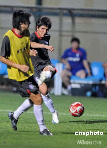 8月4日晚,韓國隊在秦皇島奧林匹克體育中心訓練場進行首次夜訓。在當晚的訓練中,韓國隊主要進行了隊員間的戰(zhàn)術、技術配合訓練。8月7日晚,韓國隊將在秦皇島奧林匹克體育中心體育場首戰(zhàn)喀麥隆。 中新社發(fā) 劉學忠 攝