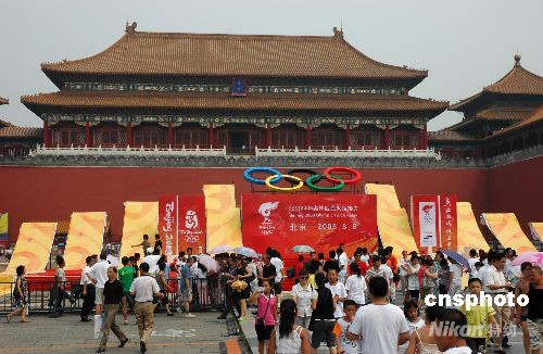 8月5日,北京故宮午門外廣場設(shè)立奧運會火炬?zhèn)鬟f起跑儀式大型舞臺。該舞臺縱深12米,寬42米,最高點達4.8米,由多幅奧運噴繪以及巨型五環(huán)等元素組成。舞臺四周將搭建玻璃鋼仿制的漢白玉欄桿,兩側(cè)甬道將設(shè)立記者席和觀眾席,預計可容納500名記者以及3000名左右觀眾。中新社發(fā) 張雙雙 攝