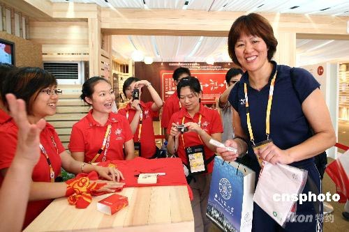 8月5日,美國(guó)女排主教練郎平在北京奧運(yùn)村紀(jì)念章交換中心內(nèi)領(lǐng)取了一件環(huán)保T恤衫和環(huán)保筷子。每件T恤衫是用從5個(gè)500毫升裝的塑料可樂瓶中提取的纖維,再補(bǔ)充一些棉纖維做成的。 中新社發(fā) 盛佳鵬 攝