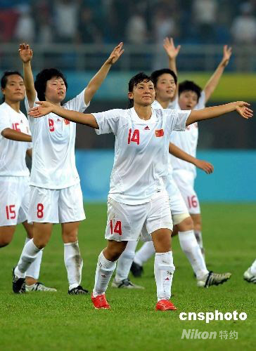 8月6日,北京奧運(yùn)會(huì)女足小組賽首輪比賽全面打響,中國(guó)女足19時(shí)45分在天津奧林匹克球場(chǎng)迎戰(zhàn)瑞典隊(duì),最終經(jīng)過(guò)90分鐘鏖戰(zhàn),中國(guó)女足憑借徐媛和韓端的進(jìn)球,以2:1擊敗對(duì)手。賽后“鏗鏘玫瑰”們歡慶勝利。中新社發(fā) 陳文 攝