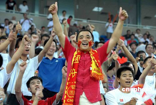 中國(guó)球迷賽后歡享勝利的甜蜜。