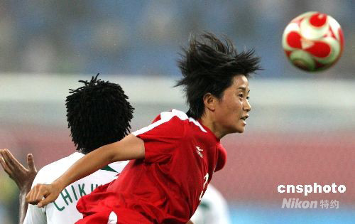 8月6日,北京奧運(yùn)會(huì)沈陽足球分賽場女足預(yù)賽,朝鮮1:0戰(zhàn)勝尼日利亞隊(duì)。圖為朝鮮隊(duì)OM Jong Ran頭球爭頂。 中新社發(fā) 張宇 攝