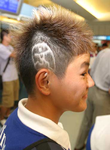參加北京奧運(yùn)的中華臺(tái)北代表隊(duì)女壘隊(duì)七日啟程,擔(dān)任女壘隊(duì)第一棒和守左外野的賴孟婷在發(fā)型上作了特殊造型,剃出北京奧運(yùn)的符號(hào)。(“中央社”圖)