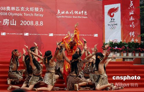 8月8日清晨,第29屆夏季奧運(yùn)會(huì)火炬,從周口店遺址出發(fā),開啟最后一天的傳遞。圖為扮演遠(yuǎn)古時(shí)代北京人的男女演員以“原生態(tài)”的舞蹈歡迎奧運(yùn)火炬。中新社發(fā) 王東明 攝