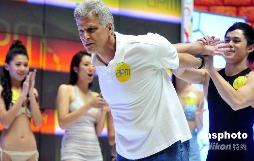 八月七日,美國泳壇傳奇人物、有“水怪”之稱曾在七二年夏季奧林匹克運動會上一舉奪取七枚金牌、成為史上在一屆奧運會上獲得最多金牌的美國前游泳運動員斯皮茨,八月七日出席在香港的宣傳活動。圖為斯皮茨在香港記者會上,示范運動員賽前的熱身動作。 中新社發(fā) 譚達(dá)明 攝