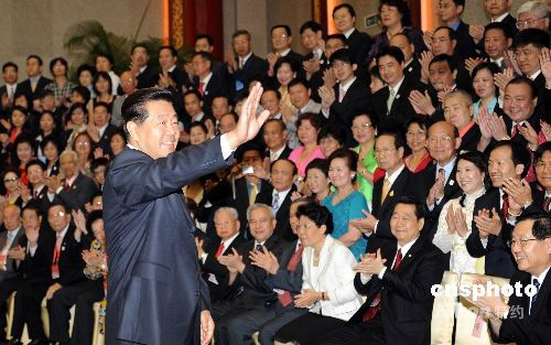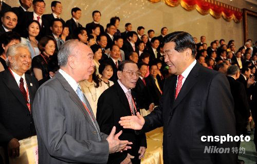 8月8日,中共中央政治局常委、全國政協(xié)主席賈慶林在北京釣魚臺國賓館會見出席北京奧運(yùn)開幕式的近200位華人華僑代表。中新社發(fā) 廖攀 攝