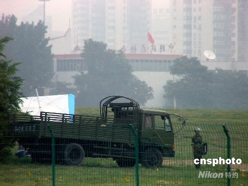 8月8日,新駐“鳥巢”周圍的中國武警防暴部隊嚴陣以待,保衛(wèi)北京奧運會開幕式的安全。包括解放軍三軍將士和保安、民兵、警察和武警在內的多支武裝力量在此駐守,維護“鳥巢”周邊地面安全。中新社發(fā) 賈國榮 攝