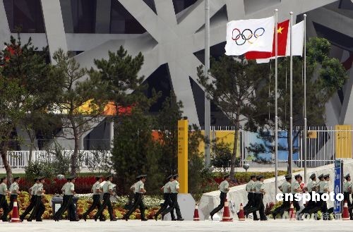 8月8日,第29屆夏季奧運(yùn)會(huì)將于當(dāng)晚在北京奧林匹克公園內(nèi)的國家體育場開幕,武警跑向“鳥巢”周邊的警戒崗位。中新社發(fā) 杜洋 攝