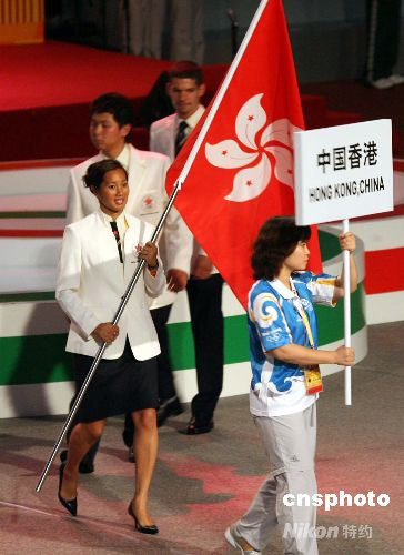 八月八日,香港特區(qū)政府在沙田賽場舉行盛大歡迎晚會上,歡迎來自世界各地參加奧運(yùn)馬術(shù)比賽的參賽隊(duì)伍。圖為香港隊(duì)入場。 中新社發(fā) 洪少葵 攝