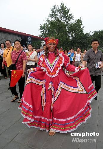八月八日,北京奧運(yùn)會(huì)開(kāi)幕式在“鳥(niǎo)巢”舉行。下午五時(shí)許,在北京十號(hào)線(xiàn)地鐵北土城的奧運(yùn)安檢出口,來(lái)自墨西哥的美女當(dāng)街盛裝熱舞。中新社發(fā) 許曉青 攝