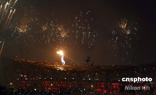 8月8日,第29屆夏季奧運(yùn)會(huì)在北京奧林匹克公園內(nèi)的國家體育場(chǎng)“鳥巢”舉行。李寧點(diǎn)燃北京奧運(yùn)會(huì)主火炬,奧運(yùn)圣火在鳥巢上空熊熊燃燒。中新社發(fā) 盛佳鵬 攝