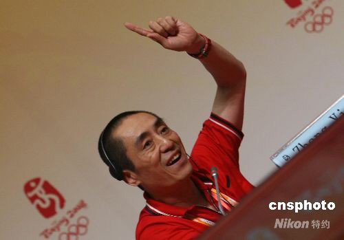8月9日凌晨,北京奧運(yùn)會(huì)開(kāi)幕式創(chuàng)作團(tuán)隊(duì)在北京奧林匹克公園主新聞中心就開(kāi)幕式等相關(guān)問(wèn)題答記者問(wèn)。圖為總導(dǎo)演張藝謀笑答記者提問(wèn)。 中新社發(fā) 武仲林 攝