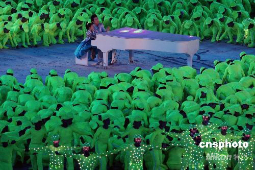第二十九屆夏季奧運(yùn)會(huì)8月8日晚在北京奧林匹克公園內(nèi)的國(guó)家體育場(chǎng)舉行開(kāi)幕式,由中國(guó)著名青年鋼琴家郎朗與女童譚小裳演奏“星光 ”曲。 中新社發(fā) 任晨鳴 攝