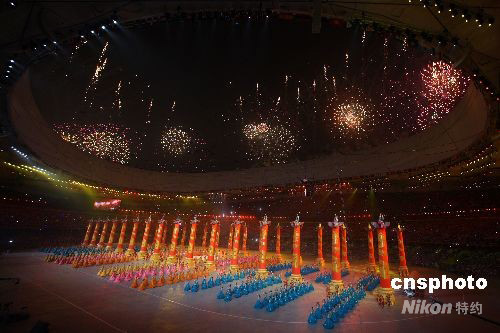 第二十九屆夏季奧運(yùn)會(huì)8月8日晚在北京奧林匹克公園內(nèi)的國(guó)家體育場(chǎng)舉行開(kāi)幕式,禮花與中國(guó)禮樂(lè)表演構(gòu)成恢弘場(chǎng)面。中新社發(fā) 任晨鳴 攝