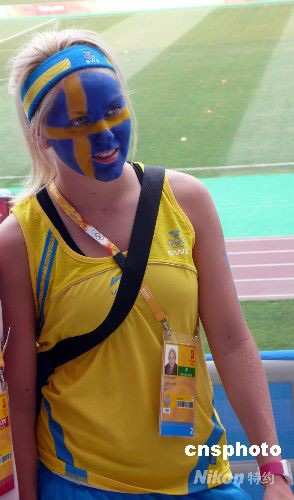 8月9日,首戰(zhàn)失利的瑞典女足在天津?qū)⒂瓉淼诙䝼對手阿根廷隊。比賽前,“全副武裝”的瑞典女球迷早早來到球場為球隊加油。中新社發(fā) 鄧霞 攝