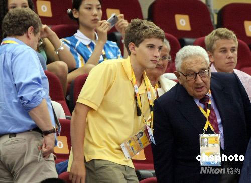8月9日下午,中國女籃在北京奧運(yùn)會(huì)籃球館--五棵松體育館舉行的小組賽首場(chǎng)比賽中,以67比64險(xiǎn)勝擊敗西班牙隊(duì)。前來參加北京奧運(yùn)會(huì)開幕式的美國前國務(wù)卿基辛格,在家人陪伴下到場(chǎng)觀看。中新社發(fā) 任晨鳴 攝
