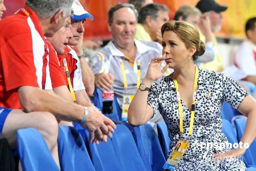 八月九日晚,北京奧運(yùn)馬術(shù)項(xiàng)目在香港沙田賽場(chǎng)舉行盛裝舞步賽事,國(guó)際馬術(shù)聯(lián)合會(huì)主席、約旦公主哈雅到場(chǎng)觀賽,并與參賽隊(duì)伍職員在看臺(tái)上交談。中新社發(fā) 鄧慶樂(lè) 攝