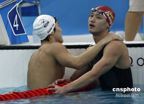 8月10日,北京奧運會游泳項目男子400米自由泳決賽上午在水立方舉行,韓國選手樸泰桓以3分41秒86獲得金牌,中國選手張琳(右)以3分42秒44獲得銀牌,圖為二人互相致賀。中新社發(fā) 杜洋 攝
