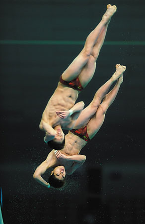 在2007年贏得世錦賽冠軍時,林躍/火亮組合的4個自選動作難度系數(shù)總和為13.3,當(dāng)時總分為489.48分。其中,裁判在比賽過程中共出示了18個10分滿分,可見兩人實力之強大。在今年2月“好運北京”第16屆跳水世界杯賽上,兩人再次折桂。不同的是,這次他們將原本壓軸的307C調(diào)整到倒數(shù)第二跳,將壓軸跳留給了難度系數(shù)高達(dá)3.8的5255B。這樣一來,難度只有3.3的207C被取代,兩人的難度系數(shù)總和也上升到13.8,在世界跳壇尚難有其他組合能夠比肩。