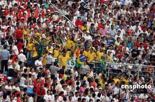8月10日,北京奧運(yùn)會(huì)沈陽(yáng)足球分賽場(chǎng)舉行男足預(yù)賽,因中國(guó)隊(duì)、巴西隊(duì)分別出戰(zhàn),場(chǎng)內(nèi)坐無(wú)虛席。中新社發(fā) 張宇 攝